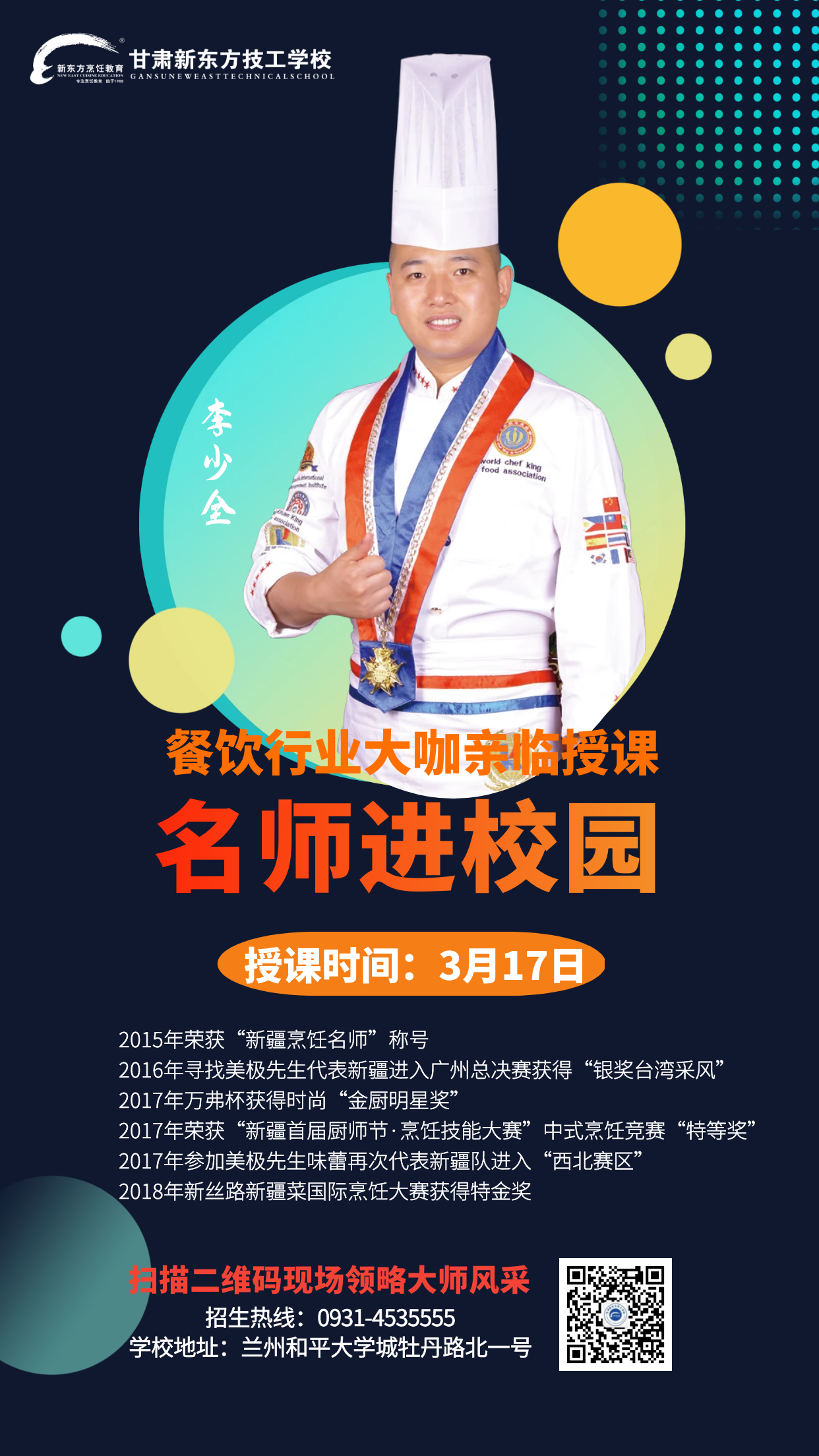 为进一步推动我校教育的创新与发展,博采众长,提升学生的专业技能水平及专业涵养,拓宽学生视野。甘肃新东方特邀请烹饪老师李少全于3月17日走进我校开讲授课、交流厨艺心得。