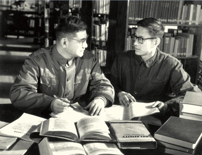 图为段一士(左一)与葛墨林合作研究规范场理论