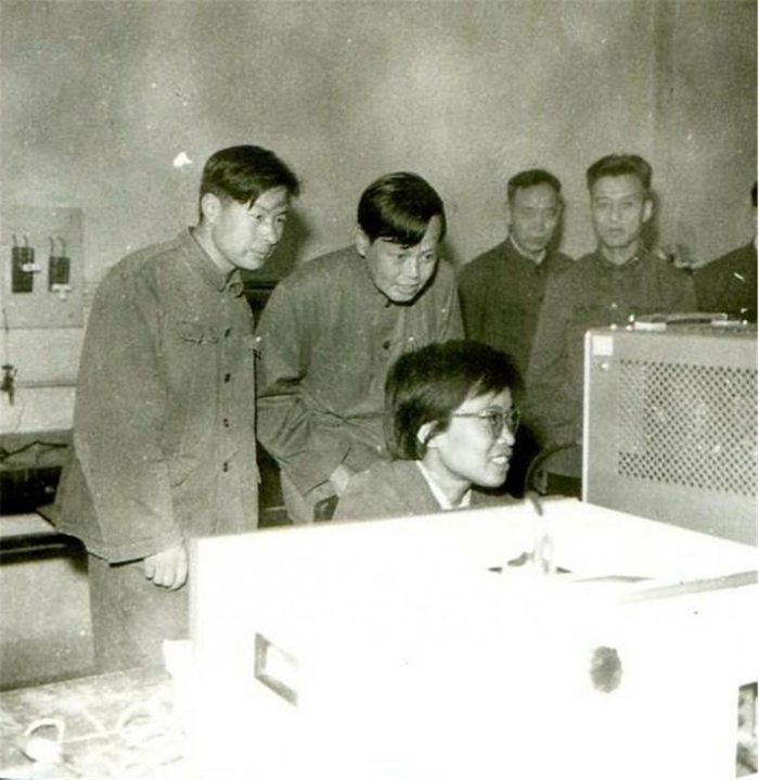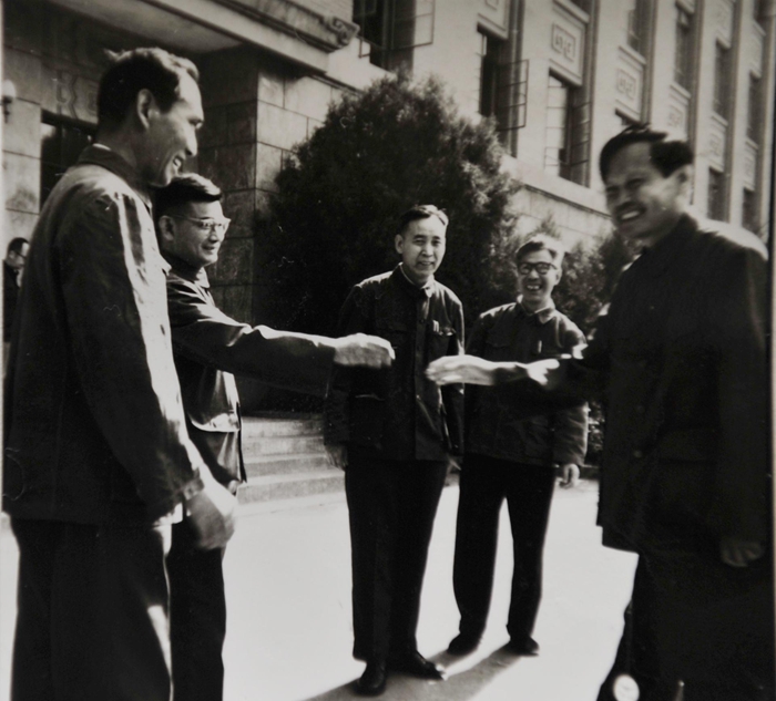 图为段一士和杨振宁(右一)等在物理楼前(1976年)