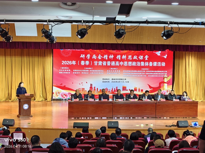 4月11日至12日,2026年(春季)甘肃省普通高中思想政治集体备课会在嘉峪关市酒钢三中顺利举行。本次活动由省委教育工委、省教育厅指导,甘肃省大中小学思政课一体化建设指导委员会普通高中“思想政治”分教学指导委员会主办,以“研学两会精神·精耕思政课堂”为主题,紧扣大中小学思政课一体化建设要求,旨在推动2026年全国两会精神与思政课程标准深度融入教学实践,充分发挥思政课立德树人关键作用。